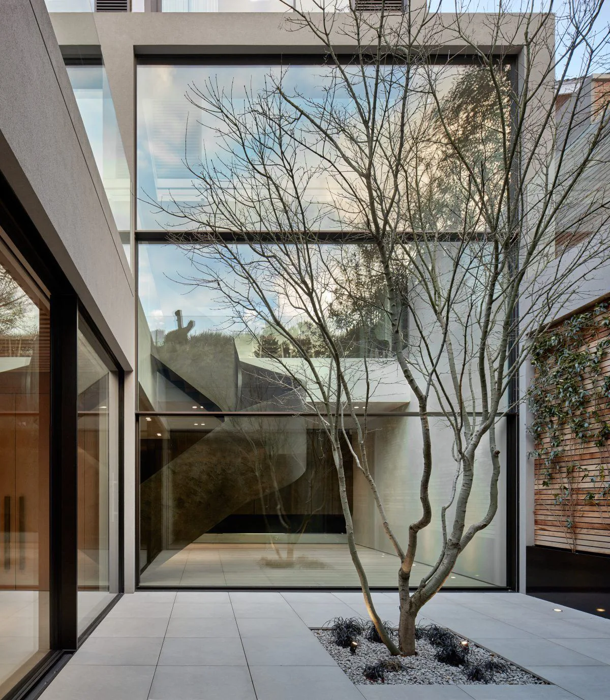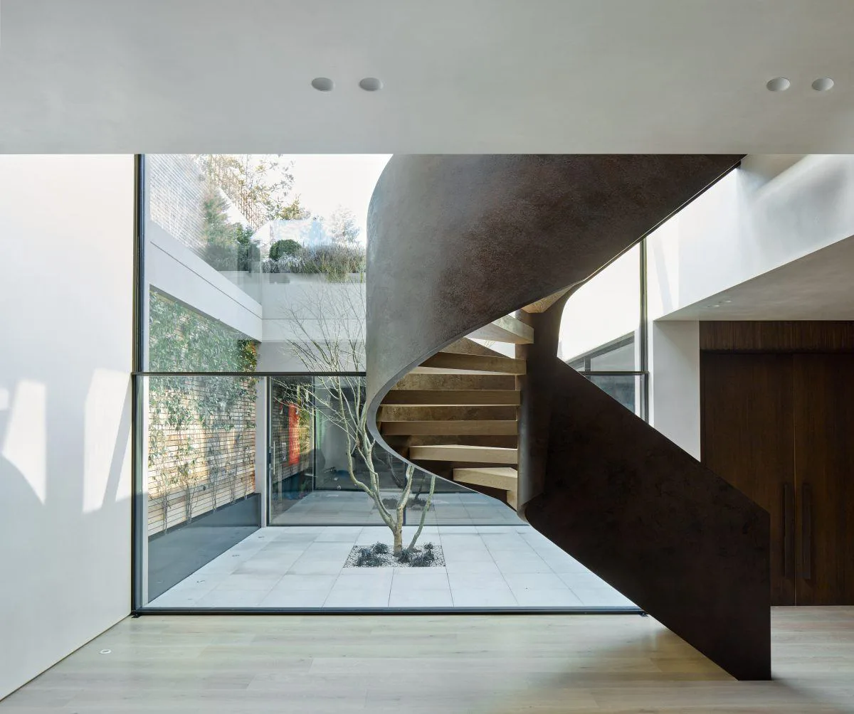 Kenwood Lee House echoes the traditional vernacular with an uncompromisingly sleek glazing to the rear which affords generous views to the woodlands to the back of the house. A board-marked concrete core forms the top-lit triple height heart to the house, articulating the relationship between intricate material details and the airy, well-considered spaces.